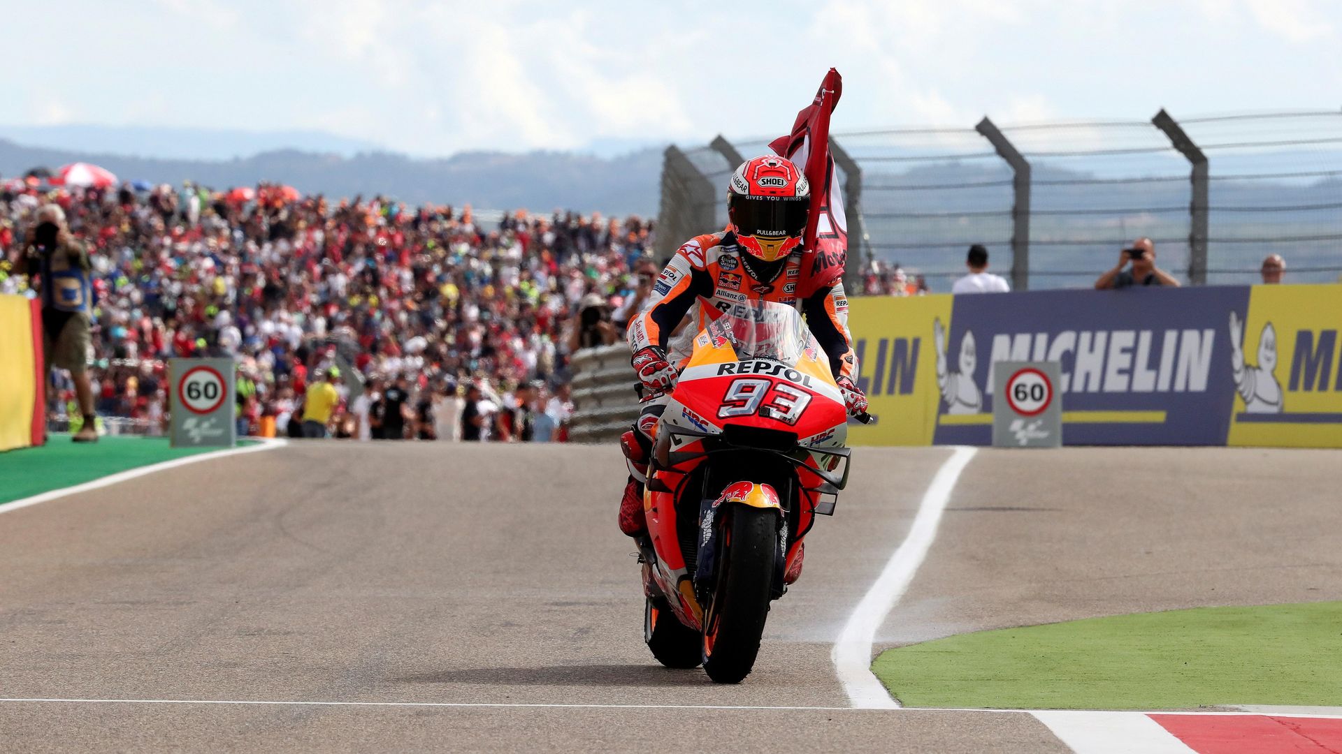 El español Marc Márquez (Repsol Honda RC 213 V) ha sumado su octava victoria de la temporada y ha puesto su sexto título mundial de MotoGP a tiro de un sólo gran premio al ganar en solitario el Gran Premio de Aragón en el circuito Motorland de Alcañiz.