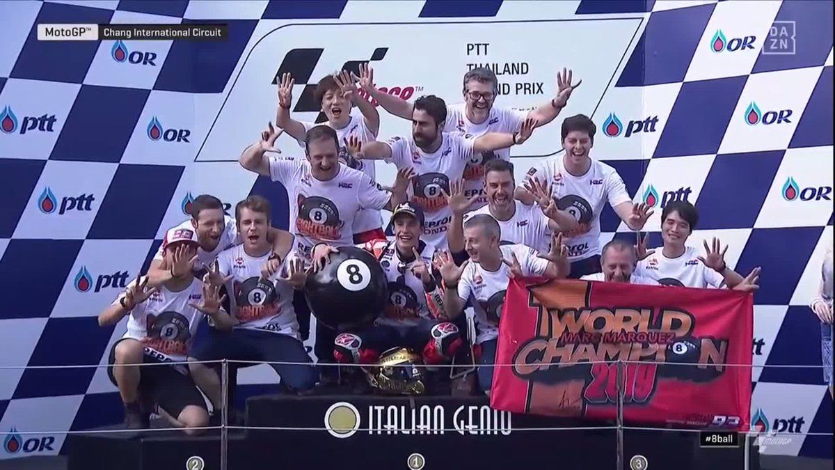 Es el octavo título mundial de Márquez, sexto en Moto GP que suma a los dos, uno de 125 cc y otro de Moto 2 que ya tenía