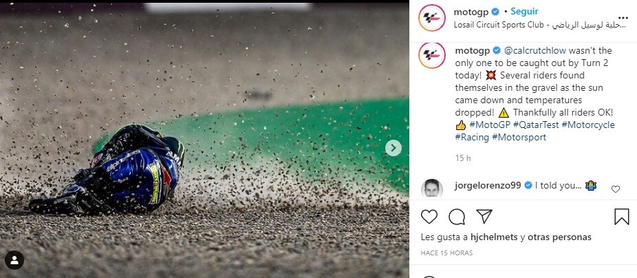 Guerra en el paddock de MotoGP que se ha trasladado a las redes sociales. La ha empezado Jorge Lorenzo, uno de los pilotos más polémicos, a raíz de una caída sufrida por el británico Cal Crutchlow (LCR Honda Castrol) durante los test que los equipos están realizando estos días en el circuito de Losail (Qatar).