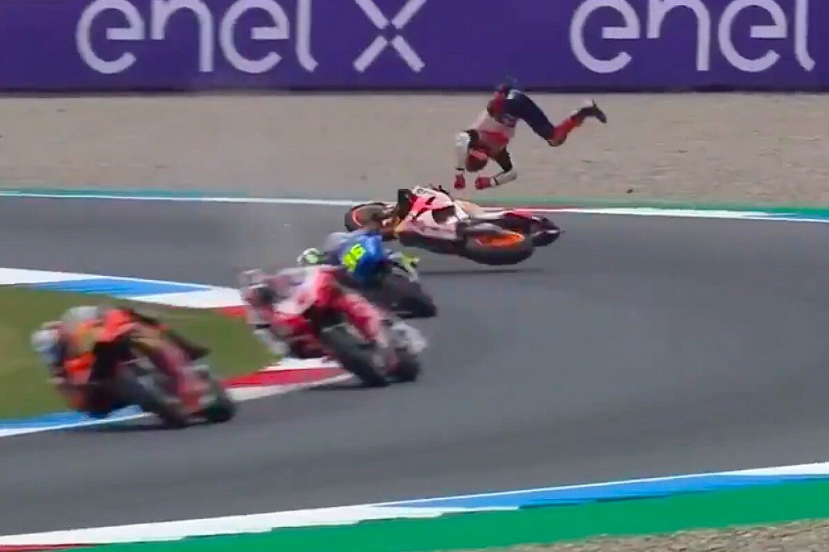 ¡Es tremendo! ¡@marcmarquez93 salió disparado de su moto a 122 km/h! ?