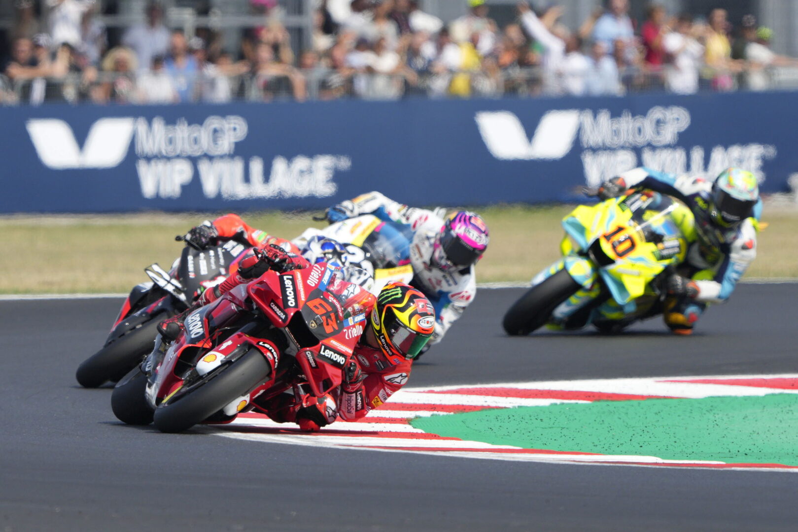 Bastiniani vio su oportunidad en el vigésimo giro y superó a Viñales, que no podía con el potencial de las Ducati y que a la postre permitió que "Pecco" Bagnaia se fuese los metros suficientes para sumar su cuarta victoria consecutiva y la sexta de la temporada.