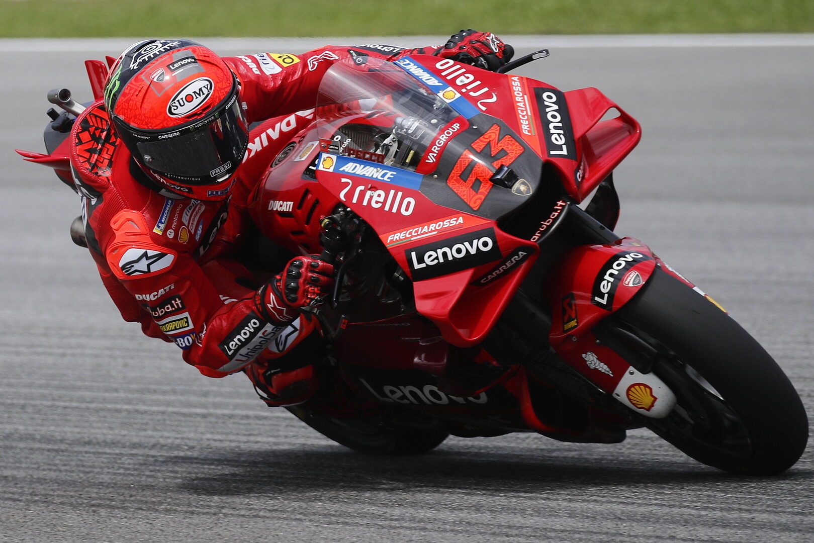 El ritmo que impuso Jorge Martín resultó brutal, al igual que en su clasificación oficial, en la que batió el récord absoluto del circuito, dejando un poco más atrás a Bagnaia para que se pelease con Bastianini y Márquez, mientras Quartararo intentaba enlazar con ellos desde algo más atrás, en un grupo en el que también estaba su compañero de equipo, el italiano Franco Morbidelli (Yamaha YZR M 1), sancionado con dos "vueltas largas" por molestar a sus rivales durante los entrenamientos.