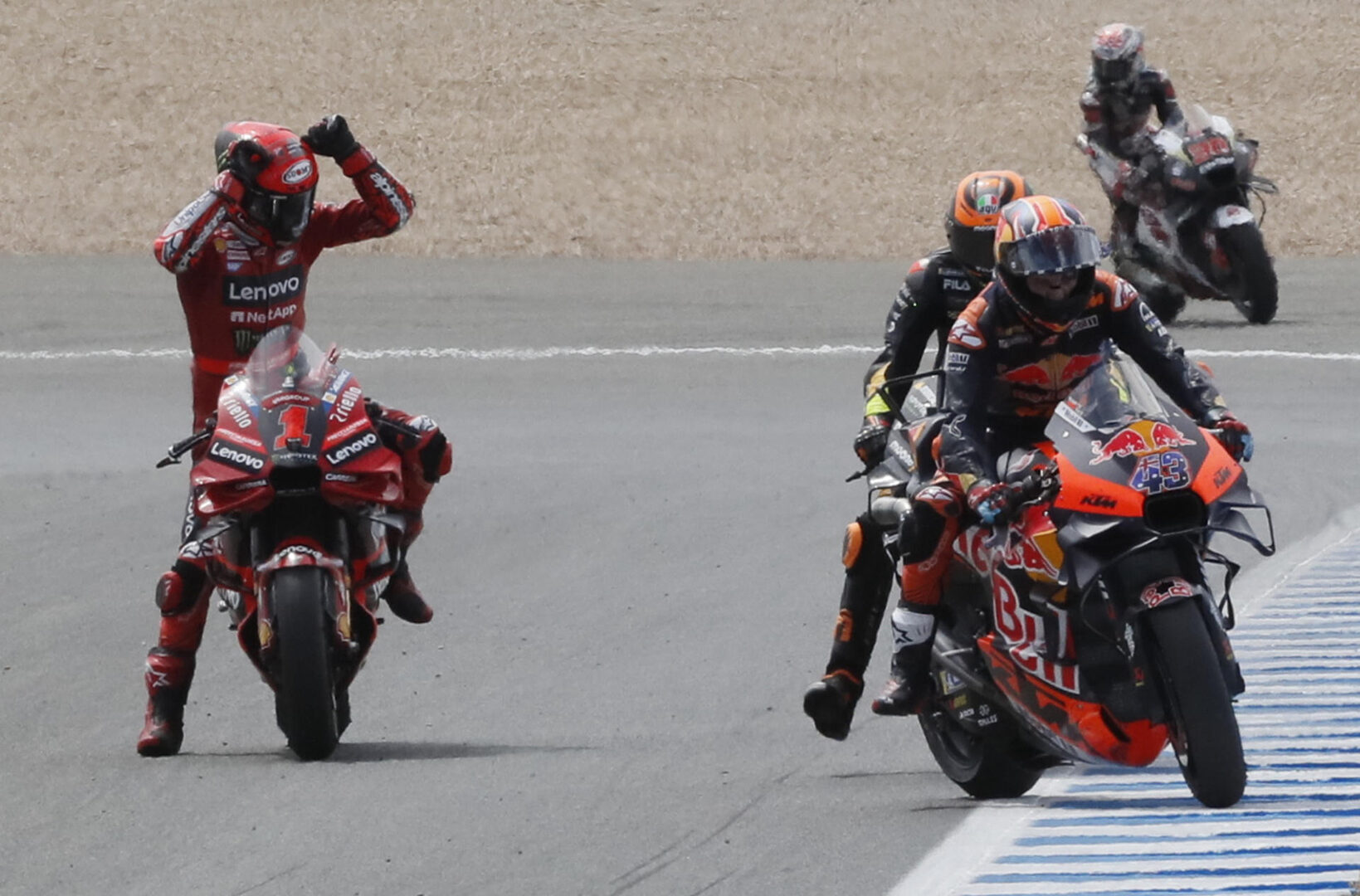 Todo en una carrera que vio la bandera roja en la primera vuelta tras un accidente en la curva 2 del francés Fabio Quartararo (Yamaha) en el que también se vieron implicados Bezzecchi y Miguel Oliveira (Aprilia). El galo quedó tendido en la grava antes de abandonar la zona por su propio pie, pero el portugués tuvo que pasar por el centro médico, donde confirmaron que se había dislocado el hombro, y no pudo tomar parte en la resalida.