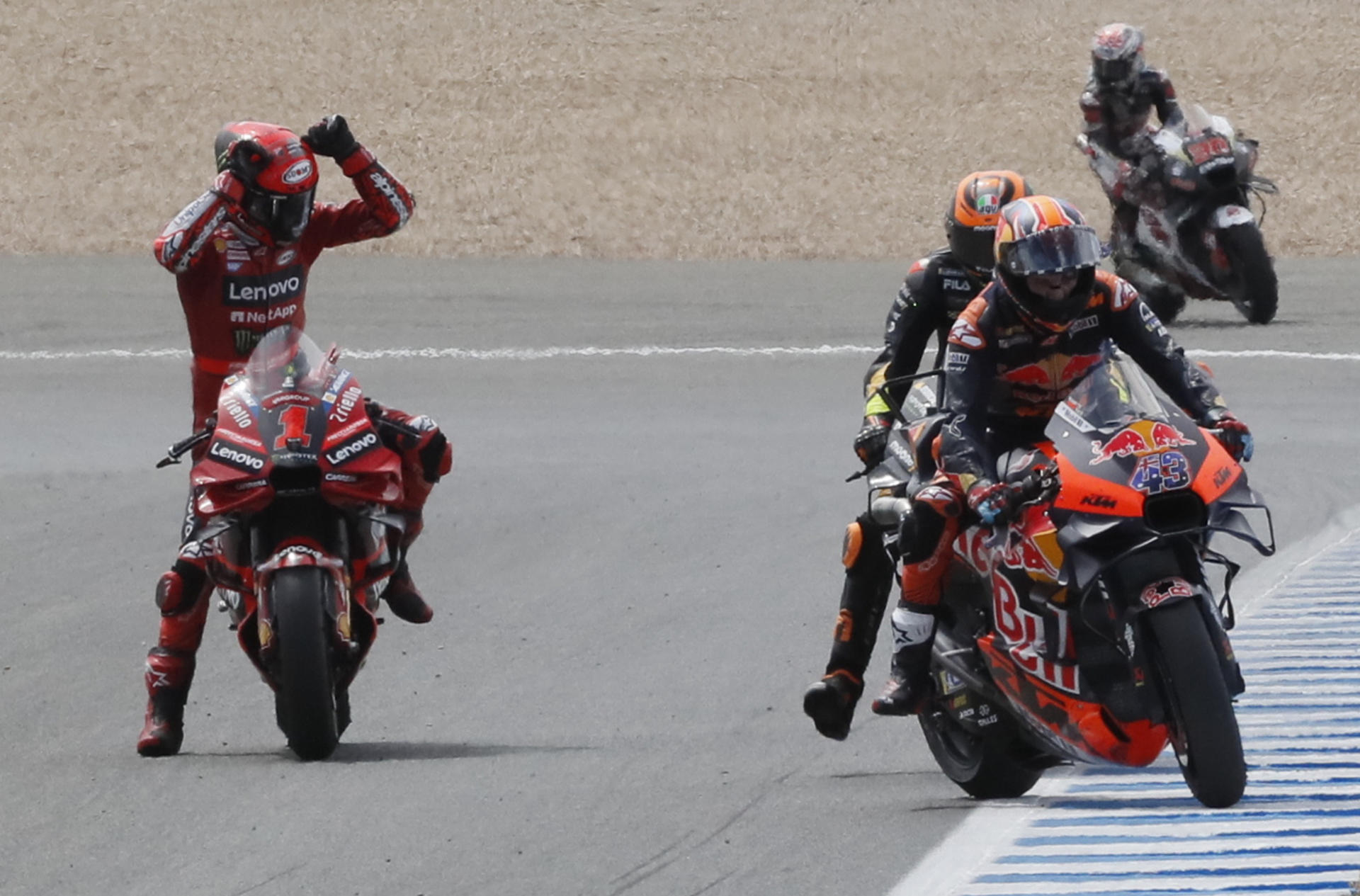 Con su segundo triunfo del año en domingo -tras el de Portugal-, más los dos al esprint -en el Algarve y en Austin-, 'Pecco' se convierte en nuevo líder de MotoGP, desplazando del primer lugar de la general del Mundial de Pilotos a su compatriota Marco Bezzecchi (Ducati), que no pudo acabar la carrera en Jerez tras irse al suelo en la curva 6 a falta de ocho vueltas.