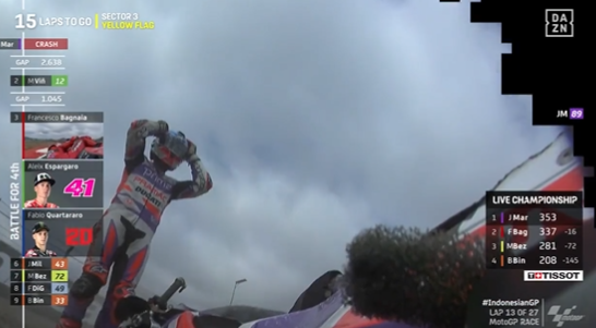 Toda España sintió su caída casi como si fuese de la propia afición misma. El español Jorge Martín lideraba el Gran Premio de Indonesia de MotoGP con tres segundos de ventaja sobre el segundo clasificado en el momento de su error y acabó fuera de la pista complicándose así el título.