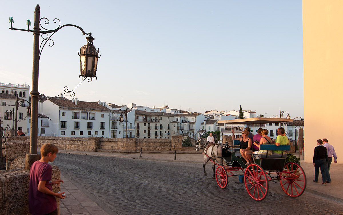 Una de las atracciones turísticas más típicas de Ronda es el paseo en los tradicionales coches de caballos, como éste que entra en el Puente Nuevo