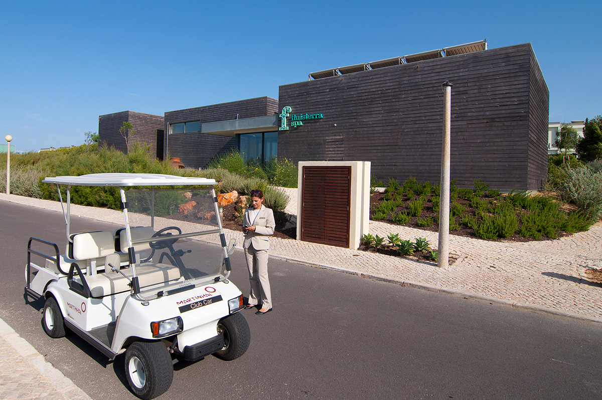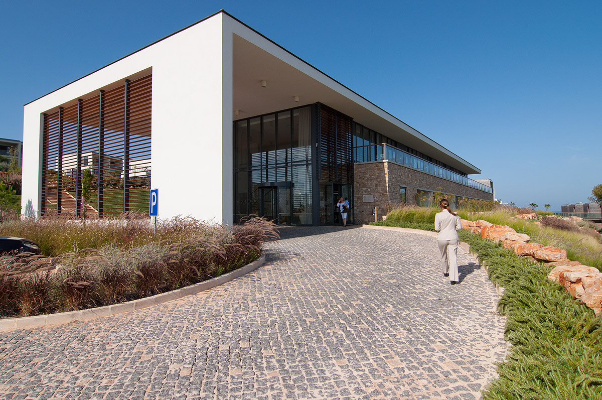 Edificio de recepción del hotel dentro de Martinhal, con una arquitectura interesante y que transmite sensación de calidad y lujo