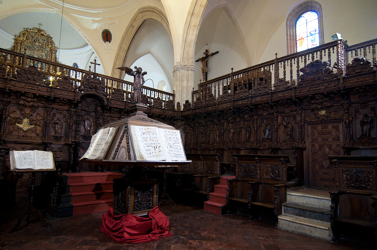 El hermoso coro en madera de nogal y cedro, de fondo el área primígena de la iglesia, de estilo gótico