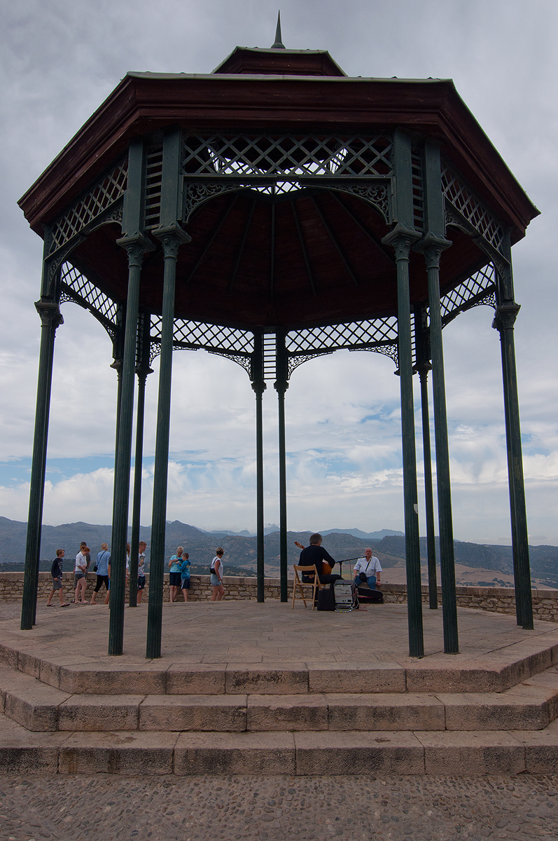 Un guitarrista deleitando a los turistas en un kiosco con espléndidas vistas a la Serranía de Ronda