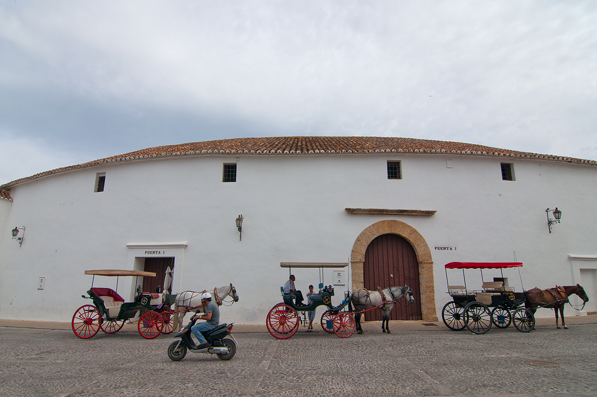 Los carruajes, una de las atracciones turísticas de Ronda, esperan clientes junto a la Plaza de Toros