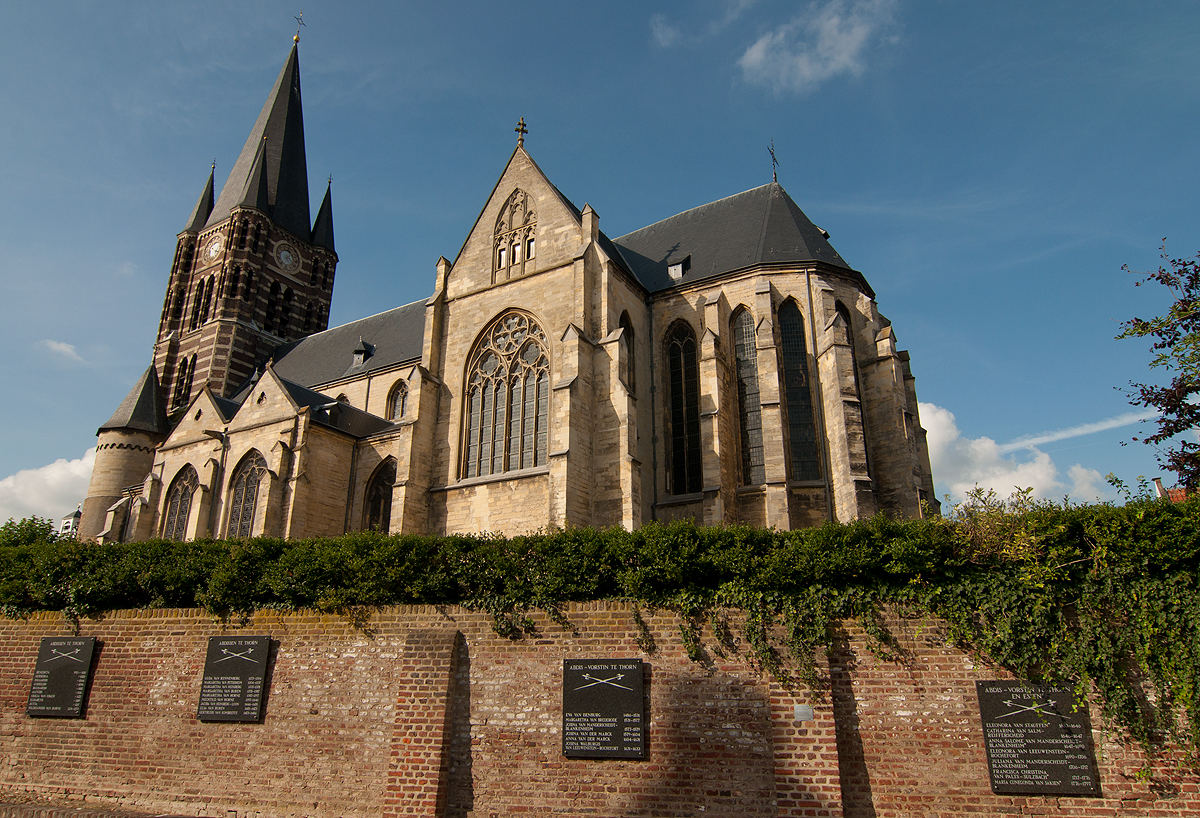 La imponente iglesia de Thorn vista desde el exterior. Las placas en el muro en primer plano muestran los nombres de todas las abadesas que tuvo la abadía