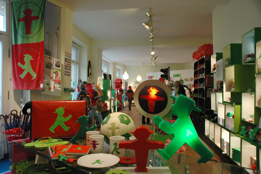 Si ya antes de la caída del Muro Berlín Oeste era una ciudad activa y trepidante, la reunificación alemana ha devuelto a la ciudad a la primera línea europea en prácticamente todos los campos, incluídas las compras. En la imagen, una tienda de recuerdos del típico Amplemann de los semáforos berlineses