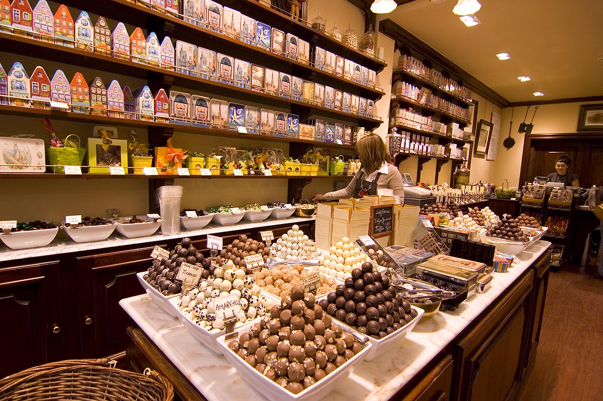La capital belga es probablemente una ciudad no demasiado bien tratada por el turismo, ya que tiene más atractivos de los que popularmente se conocen. Uno de ellos son sin duda sus excelentes tiendas, por supuesto las bombonerías y chocolaterías, pero no sólo ellas: el centro de la ciudad tiene una oferta comercial excelente en tiendas que son por sí mismas un espectáculo. En la imagen, una de las típicas chocolaterías
