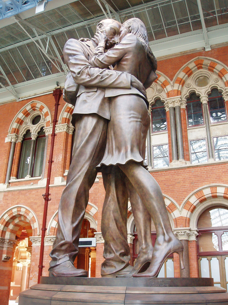 Una estatua de nueve metros de altura ensalza el romanticismo de las despedidas (o de las llegadas) en las estaciones de ferrocarril y desde su instalación en 2007 se ha convertido, pese a las muy negativas críticas recibidas, en uno de los hitos románticos del Londres actual