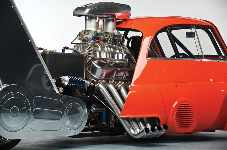 Bruce Weiner utilizó una carrocería original de Isetta del año 1959, pero ha sido convenientemente reforzada con tubos, creando una jaula de seguridad y alargando su parte trasera para poder acoplar un imponente propulsor de origen Chevrolet con 8 cilindros en V.