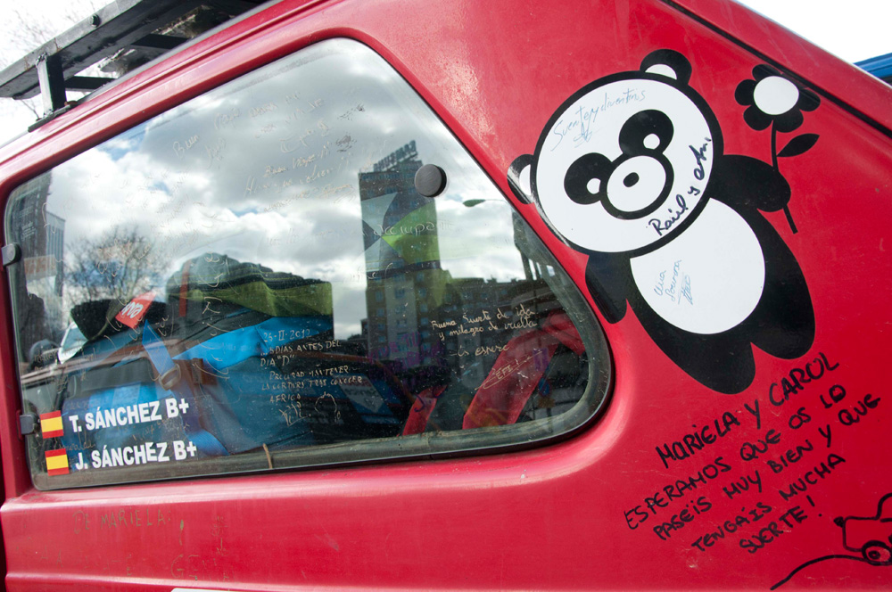 Uno de los vehículos, decorado para la ocasión y con una dedicatoria en su lateral.