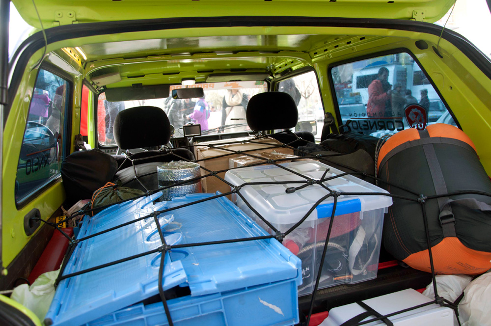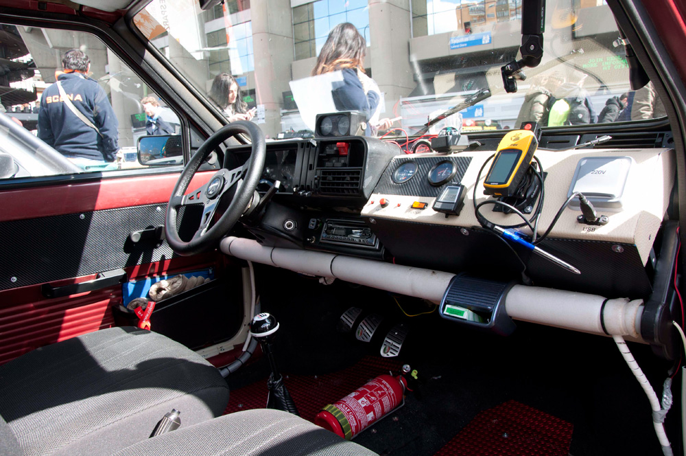 Uno de los participantes acabando de instalar parte del equipo que está permitido llevar en el vehículo.
