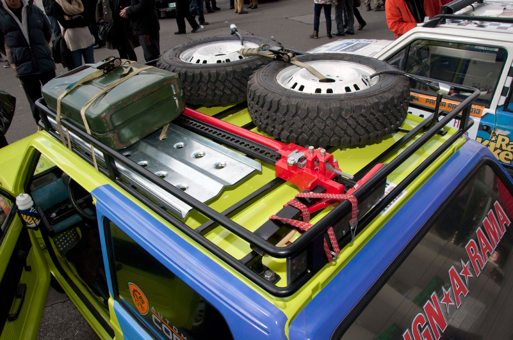 El techo de uno de los vehículos participantes. Dos ruedas de repuesto y carburante.