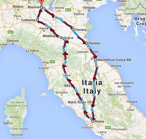 Ahora no. Ahora la recreación histórica de la carrera se divide en cuatro etapas (Brescia-Rimini, Rimini-Roma, Roma-Parma y Parma-Brescia) que se disputan durante cuatro días.