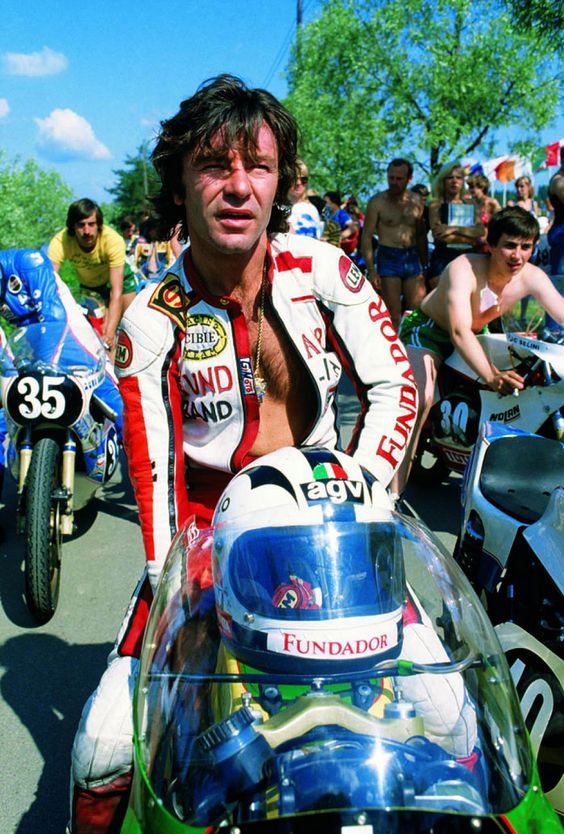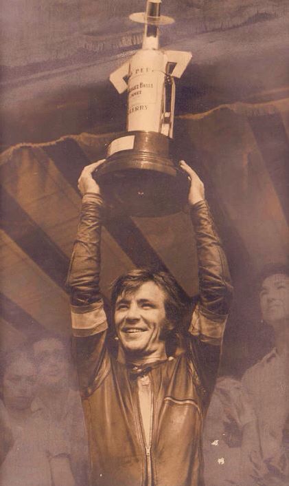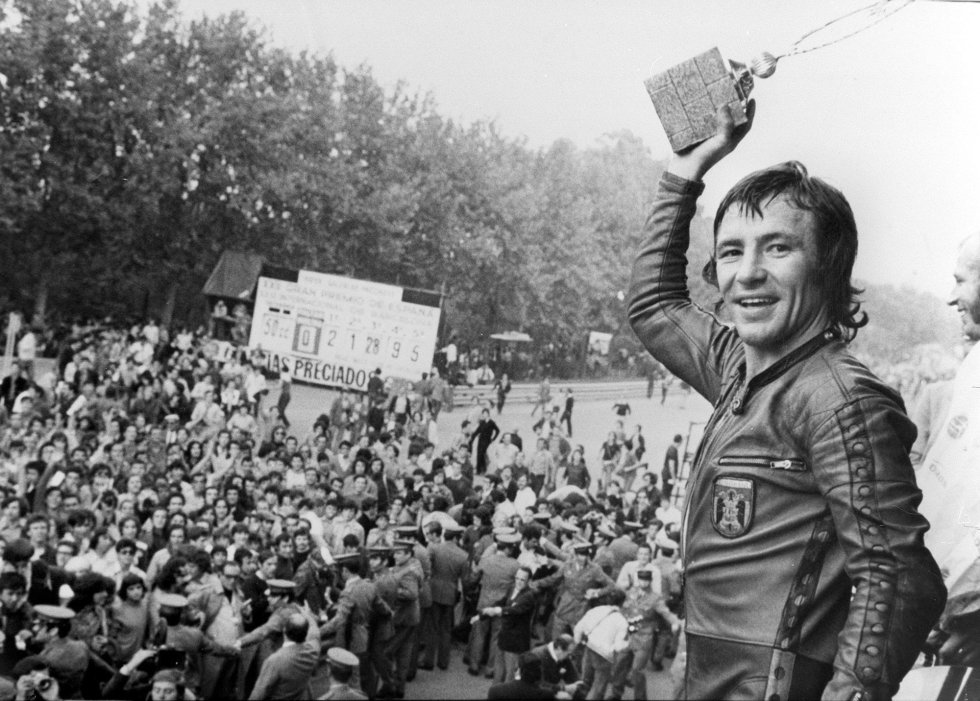 Ángel Nieto tras proclamarse Campeón del Mundo en la categoría de 50 y 125 cc., el 23 de septiembre de 1972 en el Circuito de Montjuïc.