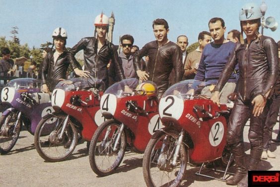 El equipo DERBI de 1964 en Montjuic al completo acompañados por Paco Tombas , Nº 1 Jan T. Huberts , Nº2 Josep Mª Busquets , Nº 3 Angel Nieto , Nº 4 Jacques Roca