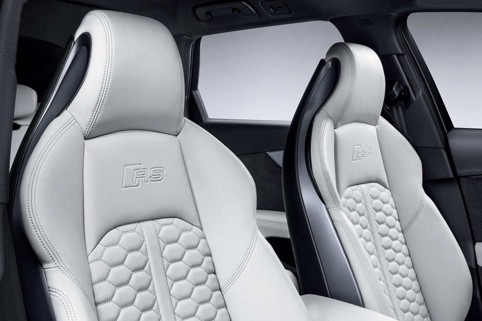 Asientos tipo bacquet de cuero y con los logos RS en el reposacabezas.