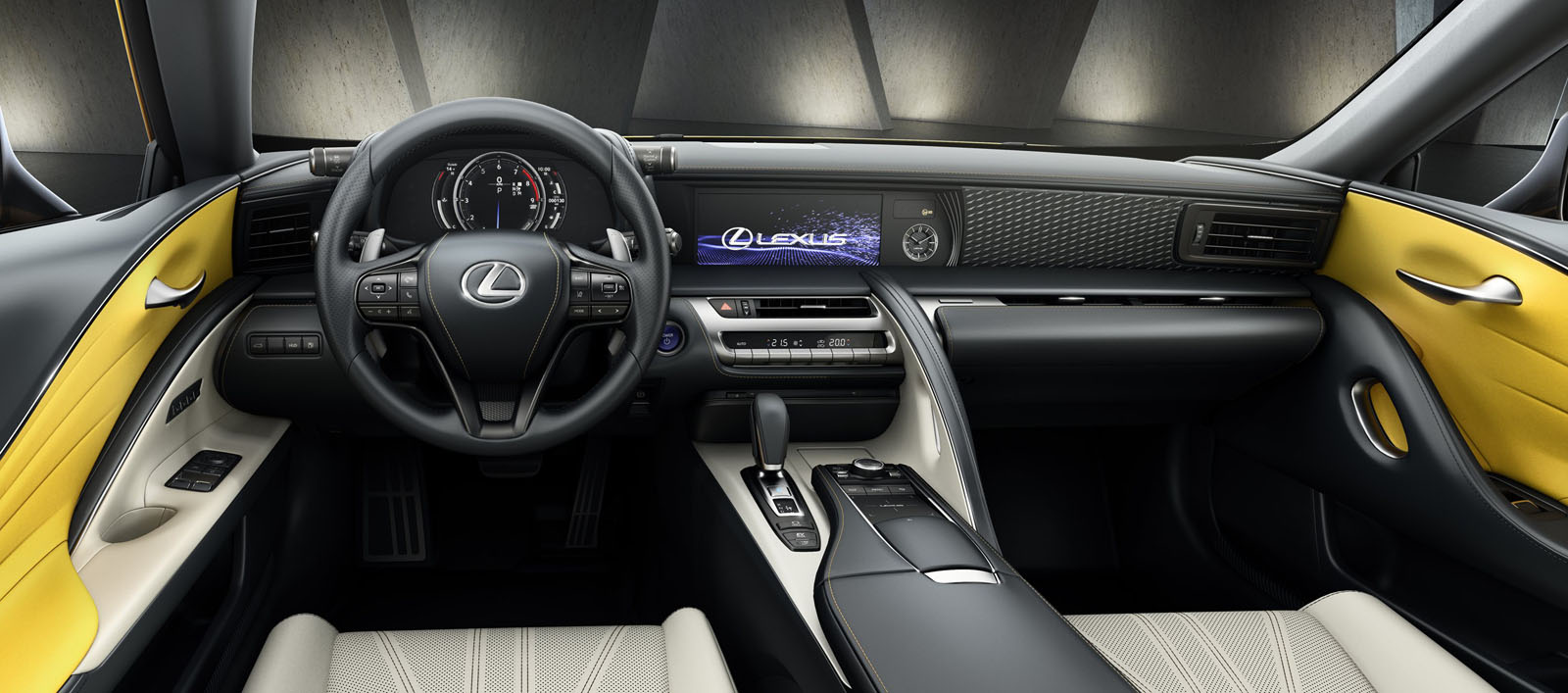 Los paneles negros de las puertas están realzados con inserciones de alcántara de color amarillo.