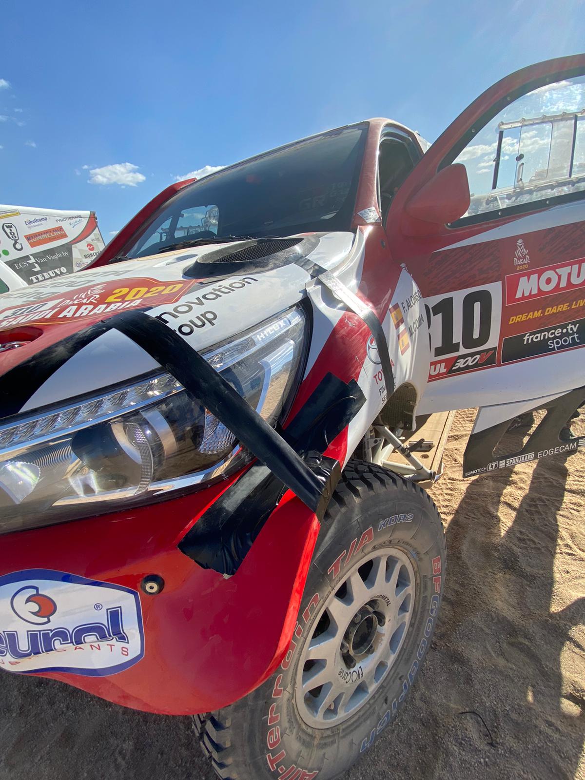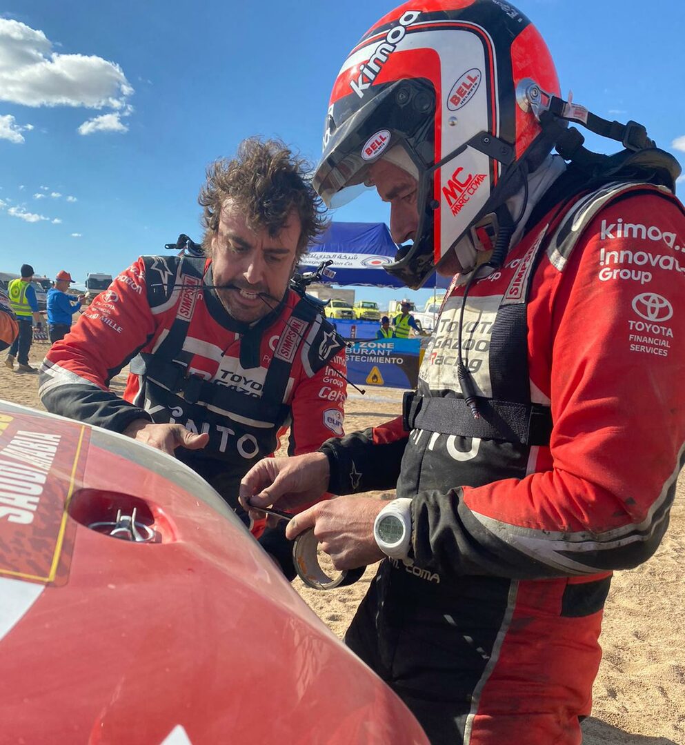 El argentino Orlando Terranova (Mini) se convirtió este lunes en el nuevo líder del Dakar al terminar segundo una etapa que se adjudicó el sudafricano Giniel De Villiers (Toyota) y donde el español Fernando Alonso (Toyota) dinamitó todas sus opciones de triunfo final por un maldito accidente. El asturiano rompió la suspensión de una rueda y se quedó detenido durante muchas horas. Fue en el kilómetro 160 cuando el Toyota Hilux 310 golpeó con fuerza una roca oculta en la arena, arrancando la rueda delantera izquierda y dañando el trapecio de la suspensión. Acabó llegando a meta con dos horas y media perdidas.