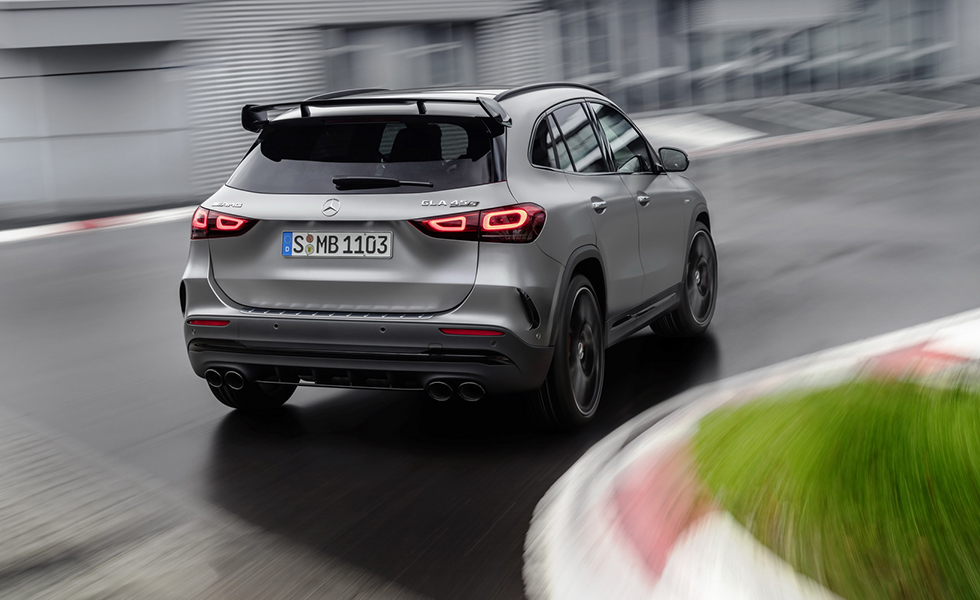 Sus salidas cuádruples de escape, sus llantas de gran tamaño y sobre todo su alerón de gran tamaño otorgan a este AMG GLA 45 su toque rebelde.