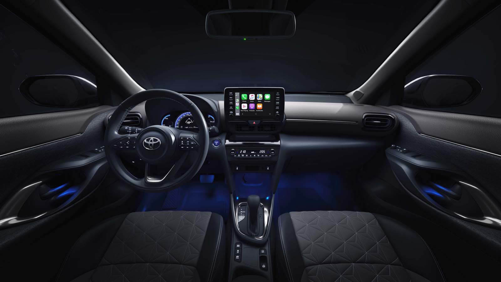 El interior se comparte con el de su hermano pequeño el Yaris y cuenta con cuadro de instrumentos digital y pantalla central de 8 pulgadas.