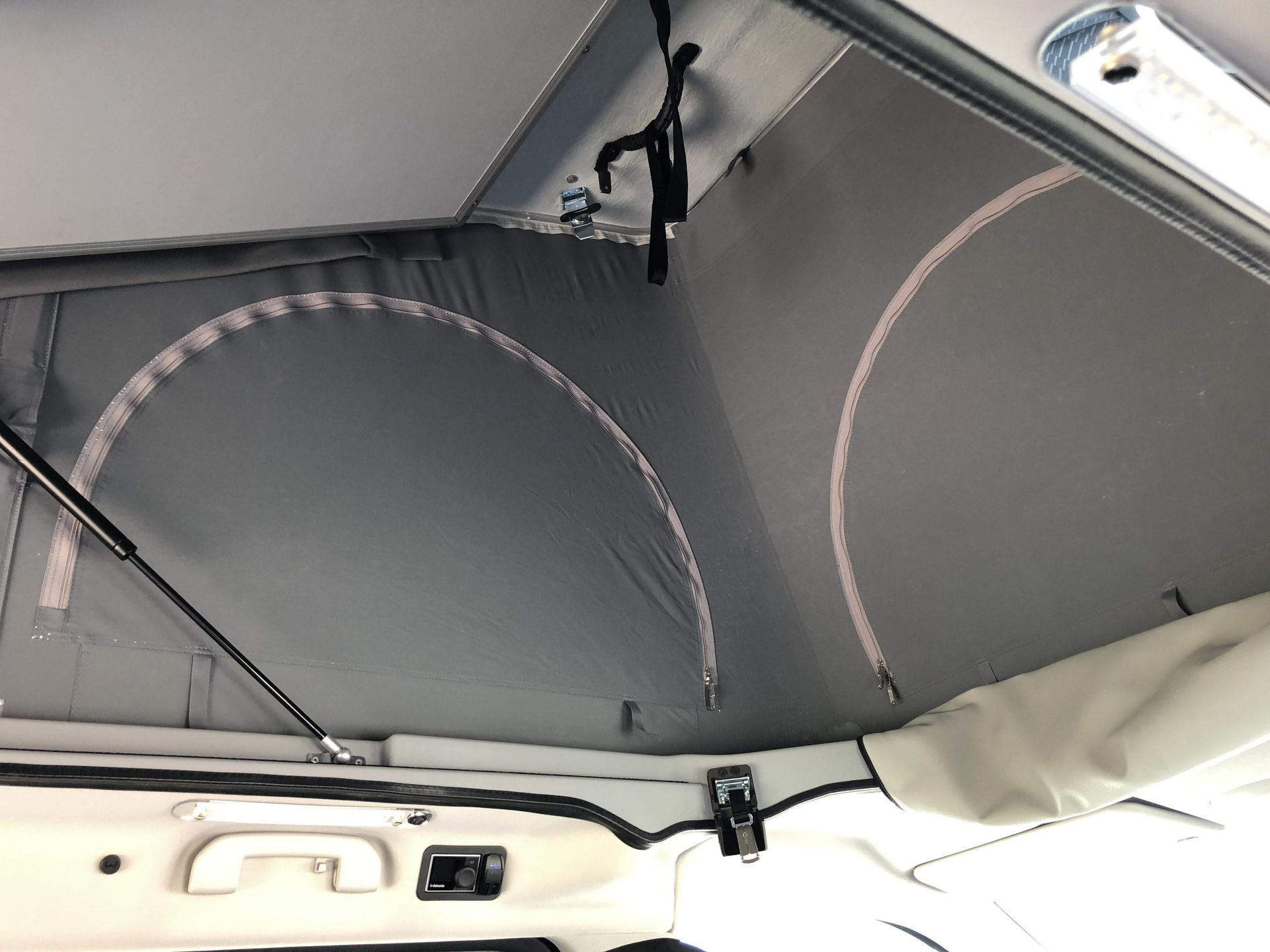 El techo elevable nos permitirá gozar de un tamaño cómodo cuando estemos de pie y además nos dará otra cama doble ahí arriba.