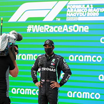 Lewis Hamilton posa con su trofeo en el podio de Hungaroring. | Cordon Press Hamilton gana con autoridad en Hungría, acecha el récord de Schumacher y se pone líder