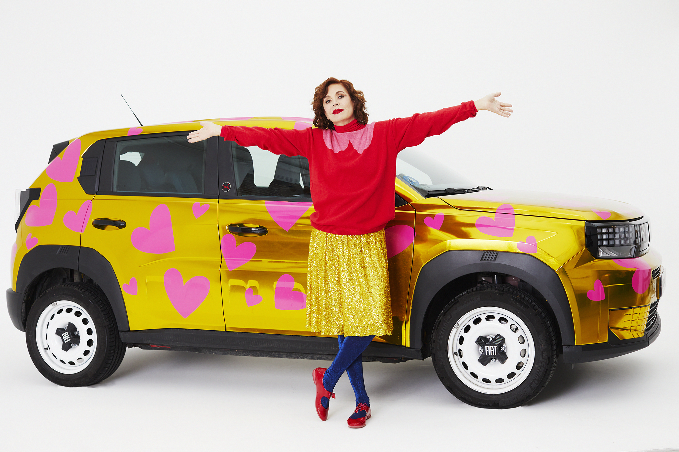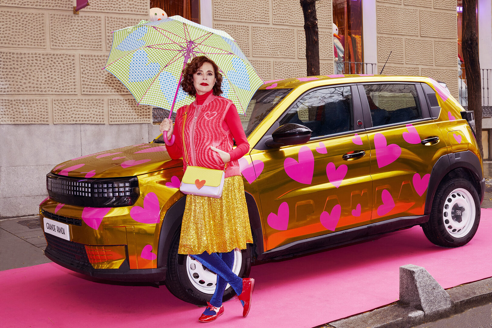 Agatha ha aplicado su inconfundible sello creativo sobre la carrocería del modelo, imprimiendo un llamativo patrón de corazones rosas sobre un fondo dorado que convierte al vehículo en una joya contemporánea. Un ejercicio de estilo que no solo aporta impacto visual, sino que encapsula la nueva filosofía de FIAT: una movilidad emocional, optimista y accesible que celebra el diseño sin complejos.