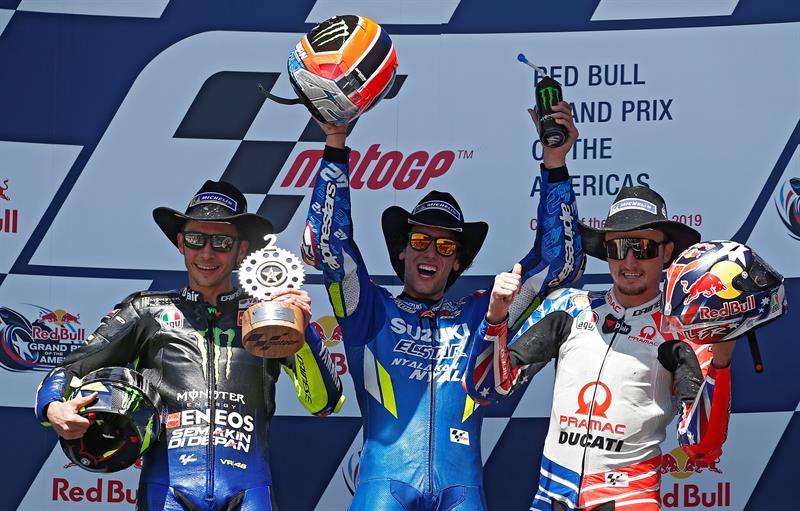 … con el permiso y el fallo de Marc Márquez, claro. Alex Rins se ha convertido en el circuito de Austin en el décimo español en ganar una carrera de la categoría reina del Motociclismo. Un hito en su palmarés y en el del motociclismo español que fue posible al fallo, no se si al despiste, de su amigo Marc Márquez. En cualquier caso sería injusto decir que Rins se subió a lo más alto del cajón por el fallo del ilerdense, sobre todo porque para lograr su primera victoria en categoría reina tuvo que vencer en pista a todo un ídolo, su ídolo, Valentino Rossi.