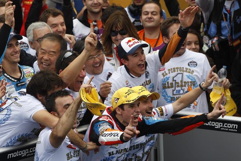 Lo ha dicho el padre de las criaturas, "mis hijos corren con humildad y clase". Sea como fuere como corren, funciona. Tanto que los dos hermanos más famosos de Cervera y de toda la parrilla del Mundial de Motociclismo han hecho historia. Al increíble palmarés que acumula ya el mayor de la saga, Marc Márquez, se le suma ahora el título de Álex en Moto3 siendo los únicos hermanos en la historia de este deporte que han logrado un título mundial en el mismo año. Qué imagen ver a Álex y a Marc abrazándose ante la atónita mirada de sus progenitores, sabiendo además que con la victoria de Álex, el motociclismo español ha firmado un nuevo triplete, el segundo consecutivo.