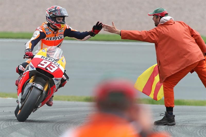 Sólo el propio Márquez puede poner freno a su histórica temporada. Sólo un fallo del campeón puede ceder el primer puesto al resto de pilotos que ya han hecho casi de todo para desbancar al de Honda. Ningún adversario ha podido con él y tampoco ninguna circunstancia. Ni empezar desde atrás, ni el sol abrasador, ni la lluvia, ni el viento han sorprendido al de Cervera que se va de vacaciones con nueve victorias de nueve posibles y con la opción de ser el primer piloto en la historia del motociclismo que gana 10 carrera consecutivas. Primera vuelta perfecta para Márquez cuya mayor virtud es su capacidad para adaptarse a las circunstancias y en Alemania lo ha demostrado. Con la pista semimojada, casi todos menos Bradl, que salía tercero, y alguno más, habían partido con las motos de lluvia en una carera decretada "flag to flag".
