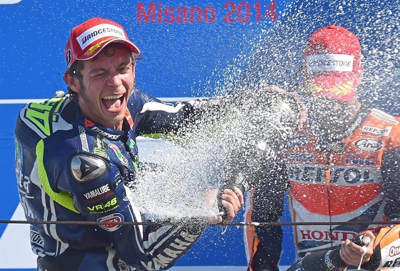 …Y los tifosi le recibieron como al líder, como si no hubiera pasado ni un segundo de su última gran victoria en Assen el año pasado. En San Marino, en el circuito de Marco Simoncelli y a pocos kilómetros de su Tavullia natal, Valentino Rossi ha conseguido la primera victoria de la temporada para él y también para Yamaha. El circuito les favorecía, la carga emocional le empujó y la mala suerte pasó de largo para mirar al que parecía intocable, Marc Márquez. Emocionado, con cientos de miles de seguidores cantando el himno italiano, seguro que Rossi rememoró cada una de esas cinco mil victorias que le han dado nueve títulos mundiales y el calificativo para muchos, del mejor de todos los tiempos. Hasta los que no somos italianos queríamos que Rossi fuera el que cruzara primero la línea de meta, pese a que era Jorge Lorenzo el que salía desde la pole y que el favorito una vez más era Marc Márquez.