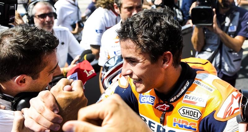 La victoria y el recital de Márquez fue el broche de oro a una jornada en la que los españoles volvieron a firma un nuevo triplete, con Rins en Moto3 acercándose al liderato que todavía ostenta Salom, y con Tito Rabat dando clases de cómo se debe gestionar un neumático cuando las condiciones son adversar para las gomas.