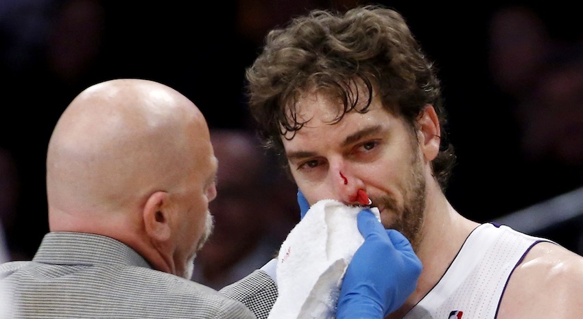 Para más inri, Pau Gasol -jugando esta vez como pívot- se lesionó en el último minuto de partido, cuando recibió un codazo en la nariz, involuntario pero imponente, de JaVale McGee (2,13 metros y 114 kilos). El jugador español tuvo que recibir atención médica para cortar la aparatosa hemorragia que sufría tras el golpe. Al acabar el partido, Gasol descartó sufrir una fractura y dijo que esperaba estar a punto para jugar la madrugada del martes al miércoles contra los Rockets en el Toyota Center de Houston.