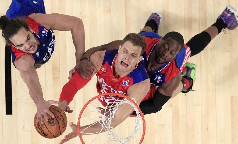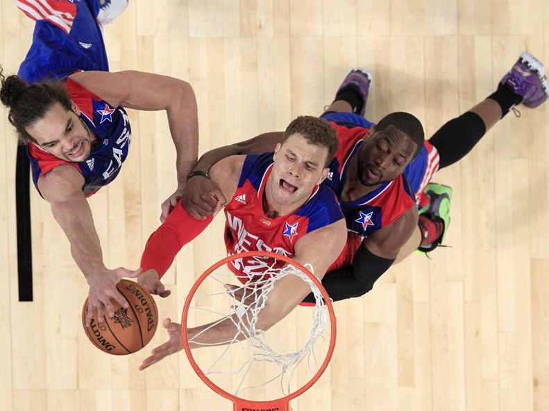 Blake Griffin, compañero de Chris Paul en los Clippers, fue otro de los jugadores decisivos en la victoria de la Conferencia Oeste al acabar con 19 puntos. En la imagen, el ala-pívot trata de anotar una canasta ante la oposición de Joakim Noah (i) y Dwayne Wade.