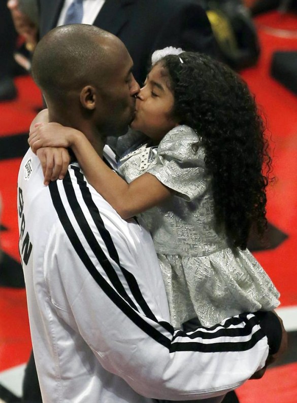 Kobe Bryant besa a su hija Natalia Diamante en un momento del partido.