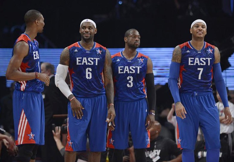 Chris Bosh (i), LeBron James (2i), Dwayne Wade (2d) y Carmelo Anthony, cuatro de los titulares del equipo de la Conferencia Este. El otro fue Kevin Garnett, ala-pívot de de los Boston Celtics que se quedó sin anotar.