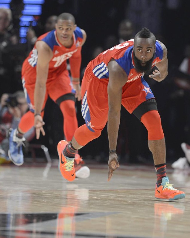 James Harden (d), escolta de los Houston Rockets que ejerció como anfitrión del All Star, volvió a coincidir sobre la cancha con su excompañero en los Oklahoma City Thunder, el base Russell Westbrook (i).