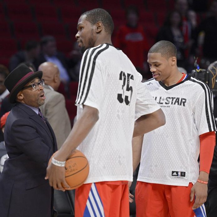Kevin Durant y Westbrook saludan en el Toyota Center al director de cine Spike Lee.