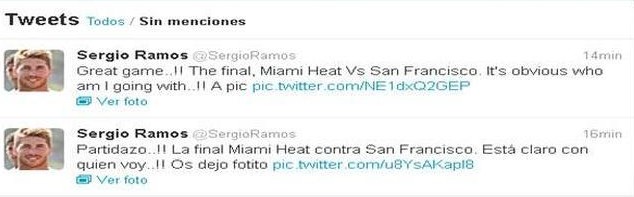 Nada más llegar al estadio, Ramos colgó en Twitter una foto acompañada de este comentario: "Partidazo. La final Miami Heat contra San Francisco. Está claro con quien voy".