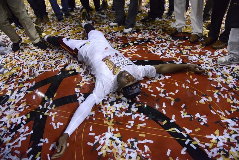 Dwyane Wade celebra su victoria en el séptimo con un baño de confeti.