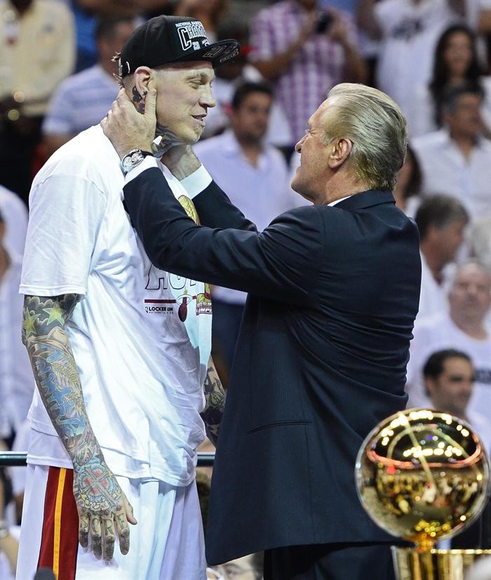 El jugador de los Heat Chris Anderson se abrazó al mánager del equipo, Pat Riley.