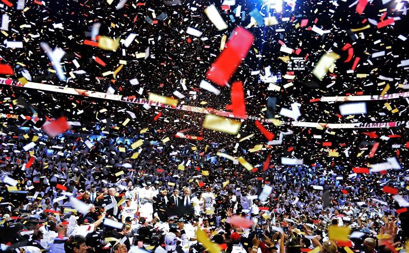 El confeti vuela sobre los jugadores de los Heat de Miami tras revalidar el título de campeones de la NBA.