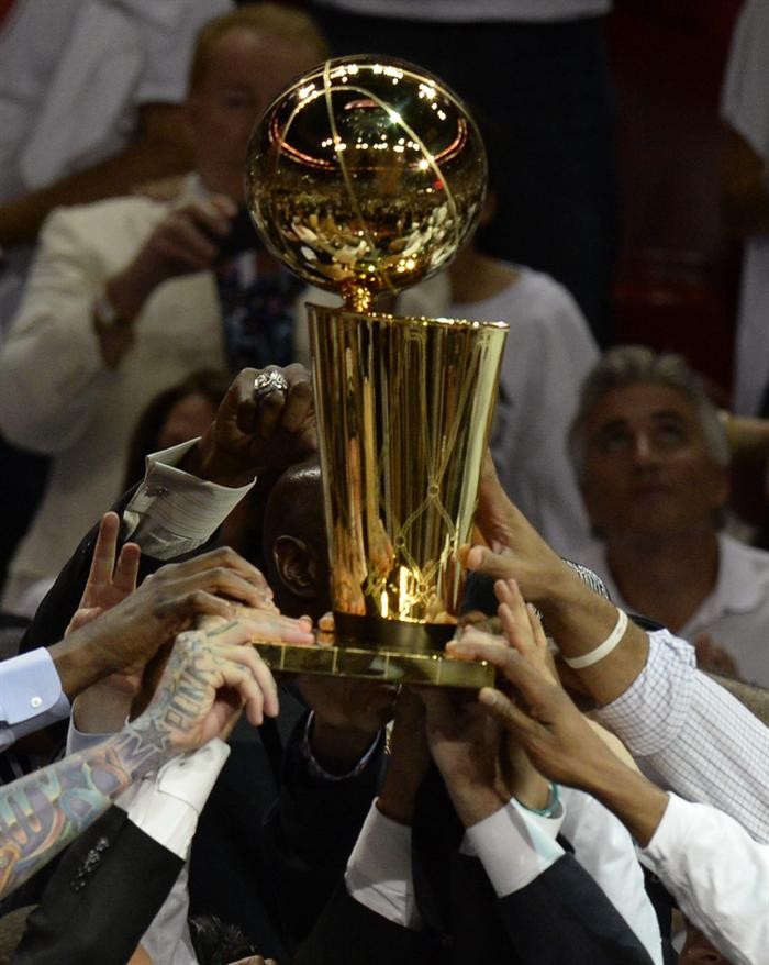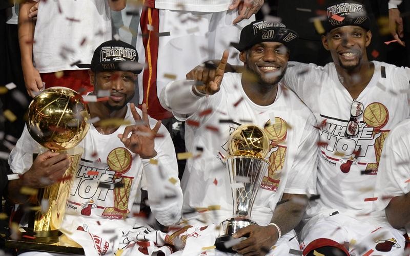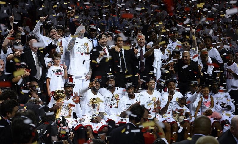 Los jugadores de los Heat de Miami levantaron el trofeo que les acredita campeones de la NBA.