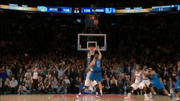 El ala-pívot alemán Dirk Nowitzki no tuvo acertado en sus lanzamientos, pero tuvo la suerte de encestar su último lanzamiento para dar a los Mavericks la victoria a domicilio por 110-108 sobre los Knicks de Nueva York.